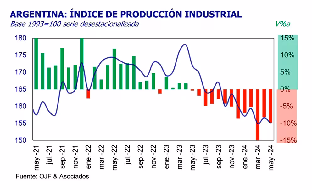 “La actividad industrial retrocedió en mayo, aunque no volvió a tocar el piso que había encontrado en marzo. Así, la serie desestacionalizada marcó una baja de 1,0% mensual, quedando 3,1% por debajo del nivel que tenía en diciembre. En la comparación anual, la caída fue de 9,8%, donde las mayores contracciones se produjeron en maquinaria y equipo (-23,8%), Minerales no metálicos (-25,8%), y metales básicos (-33,5%)”, indicó OJF. En los primeros cinco meses del año el balance es negativo: una contracción fabril de 9,2% en comparación con enero-mayo de 2023.