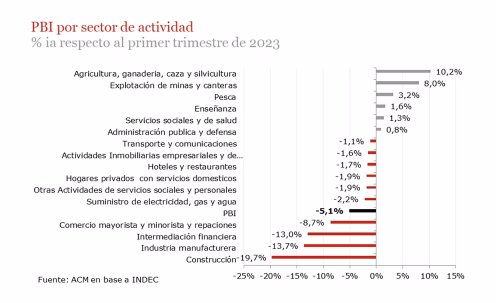 “Las políticas iniciales implementadas, como el realineamiento de precios relativos y el significativo ajuste cambiario de diciembre, buscaron corregir los desequilibrios macroeconómicos pero exacerbaron la inercia inflacionaria a comienzos de año. Esto puede explicar en gran medida la contracción económica observada durante el primer trimestre de 2024. Tanto desde el lado de la oferta como de la demanda se registran señales de contracción”, estimó la consultora ACM