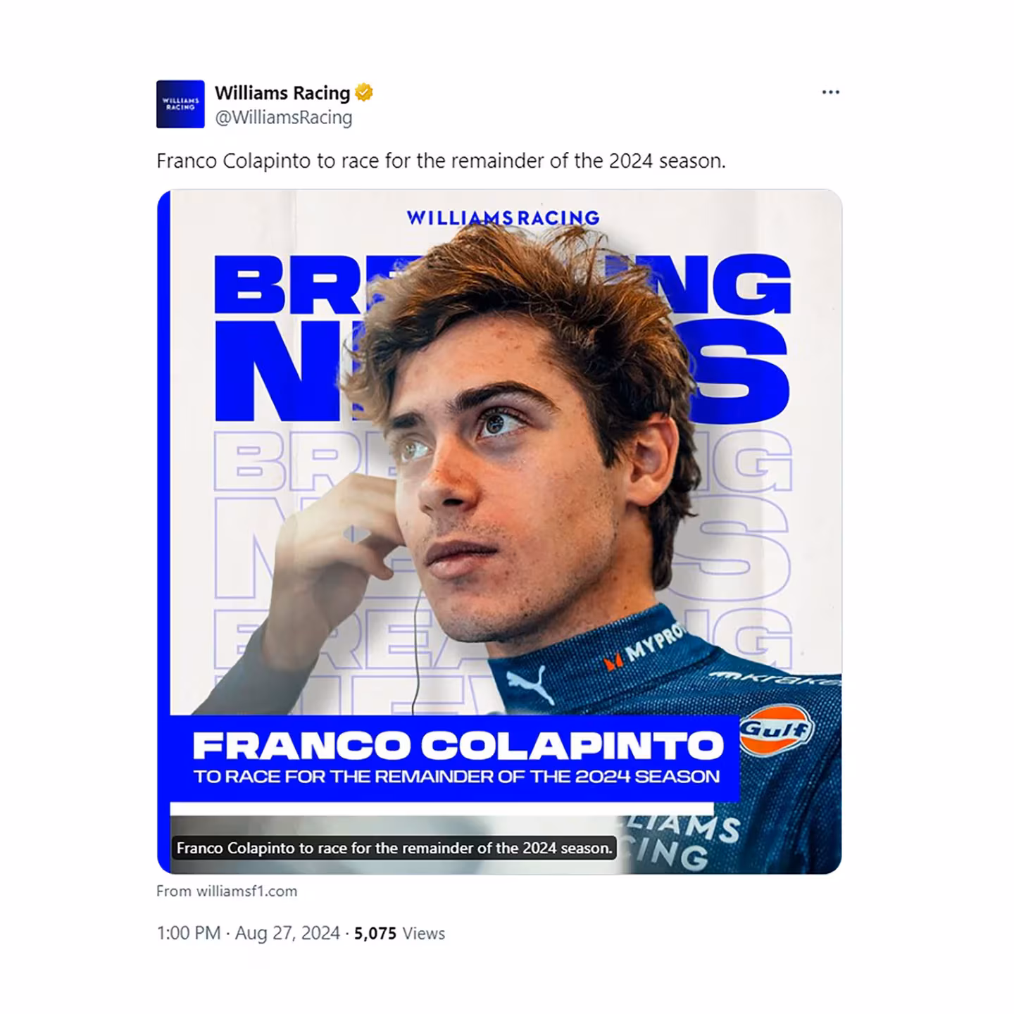 Pasadas las 13 horas de la Argentina, Williams hizo el anuncio oficial en sus redes sociales. “Franco Colapinto competirá por el resto de la temporada 2024″, escribieron con la foto del oriundo de Pilar. El piloto bonaerense “es miembro de la Williams Racing Driver Academy e hizo su debut en la FP1 en el FW46 de este año en el Gran Premio de Gran Bretaña. Su campaña en F2 este año le ha llevado a conseguir una victoria en Imola y podios en las carreras de Barcelona y Austria, así como otros siete puntos. Se convertirá en el 49º piloto de Gran Premio para Williams Racing”, informaron desde el equipo británico.