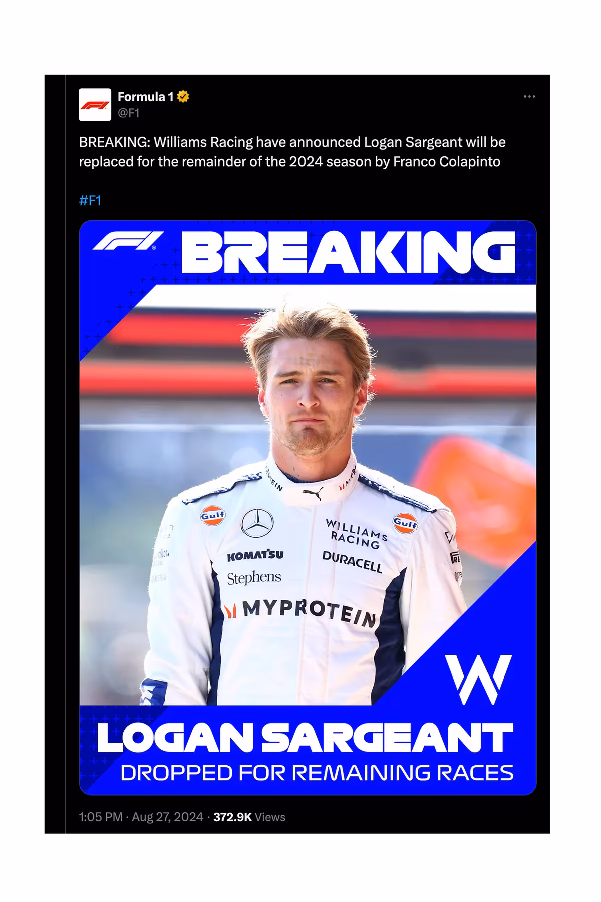Si bien Sargeant sabía que no iba a tener lugar para el 2025, la idea era que finalizara como parte del equipo en este certamen más allá de las habituales críticas del jefe de Williams, James Vowles, por su mal nivel. Sin embargo, lo que precipitó el movimiento fue un error que el corredor estadounidense de 23 años cometió en la tercera práctica del sábado en el circuito neerlandés de Zandvoort:destrozó su vehículo y no pudieron repararlo  para que sea parte de la clasificación de ese mismo día. Y los rumores se encendieron…