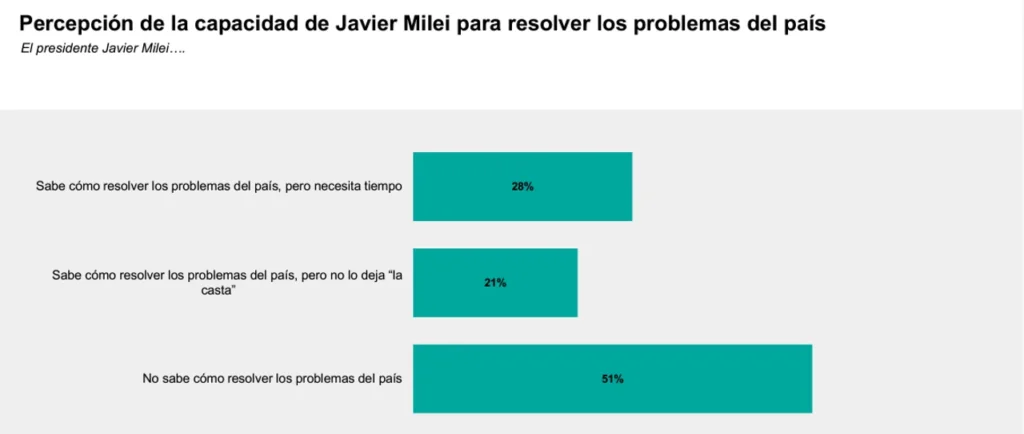 Incluso el porcentaje en favor del economista sube cuando se le pregunta a los encuestados sobre su capacidad para resolver los problemas del país. En este punto un 49% lo considera capaz, uno por ciento más que su imagen positiva. En este punto en particular se nota como la polarización la “la casta” sigue dándole frutos a la administración libertaria. El 21% de los entrevistados cree que Milei sabe como resolver los problemas del país, pero no lo deja “la casta”.