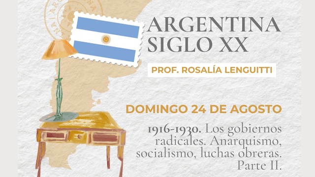 El próximo domingo 23 de agosto, la profesora Rosalía Lenguitti dará continuidad al ciclo de charlas sobre historia argentina, con un encuentro dedicado a los gobiernos radicales y los movimientos sociales de principios del siglo XX.