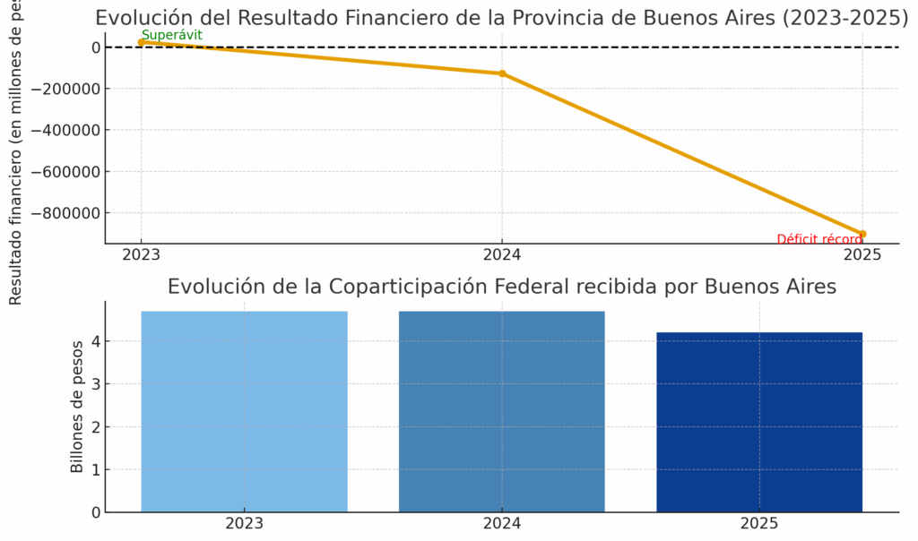 Según el informe oficial, la Provincia de Buenos Aires registró un déficit financiero de $902.431 millones en el segundo trimestre del año. El dato contrasta con los $127.480 millones del mismo período de 2024, lo que representa un deterioro del 607,9% interanual. Apenas dos años atrás, a mediados de 2023 —antes del cambio de gobierno nacional—, los números mostraban un superávit de alrededor de $25.000 millones.