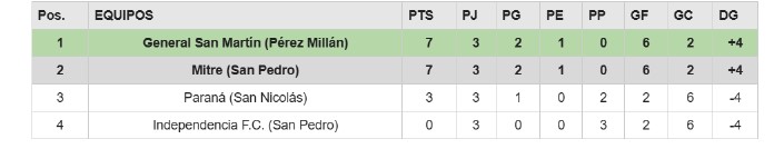 Por su parte, General San Martín lidera hasta el momento la Zona 6 de la Región Pampeana Norte con siete puntos, la misma cantidad y diferencia de gol que Mitre de San Pedro. En lo que va del certamen, el equipo de Pérez Millán superó 3-0 a Paraná y 2-1 a Independencia, mientras que empató 1-1 frente a Mitre.