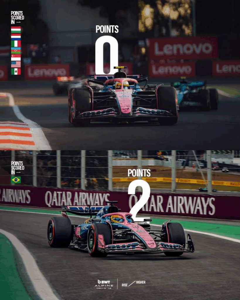 Acertadamente, todos lo tomaron como una absurda comparación de lo sucedido en Interlagos, y pocos notaron que muy pequeño a la izquierda apenas se leía «puntos anotados en» y una serie de banderas tamaño emoji representando los grandes premios sin porotos sumados por el equipo. En la imagen de Gasly, colocaron la de Brasil, donde logró los dos puntos aludidos. El texto que acompañaba a la imagen rezaba: “Paso a paso. Aunque nuestro objetivo es 2026, no nos rendimos. Un pequeño botín de puntos para llevar de vuelta a la base y para las últimas tres fechas de la temporada”.